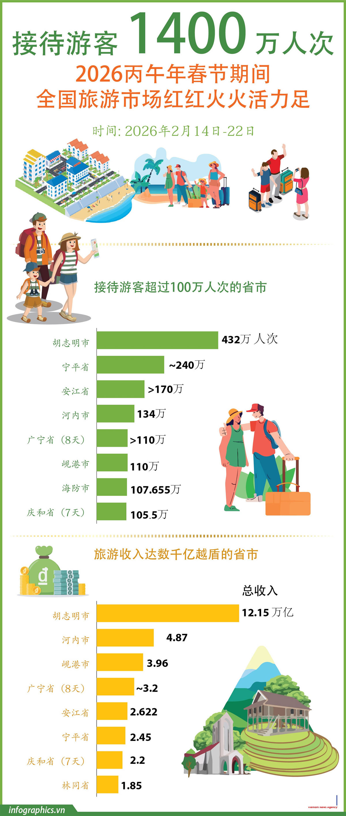 (北宁报网)据越南文化体育旅游部国家旅游局估计,2026年丙午春节9天假期,全国旅游业预计共接待约1400万游客,同比去年增长12%,预示着全国旅游业将迎来一个充满活力、安全且蓬勃发展的旅游旺季。