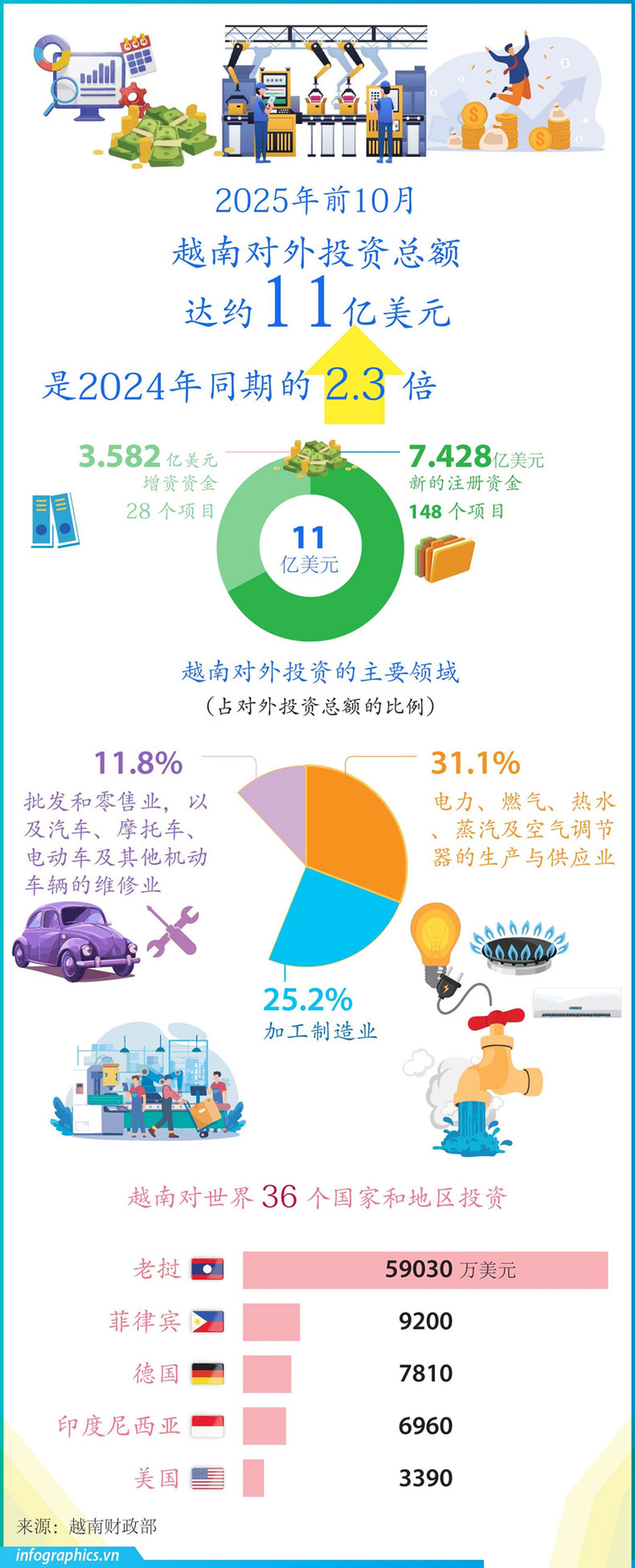 (北宁报网)2025年前十个月,越南对外投资总额(包括新增资金和新的注册资金)达11亿美元,是2024年同期的2.3倍。