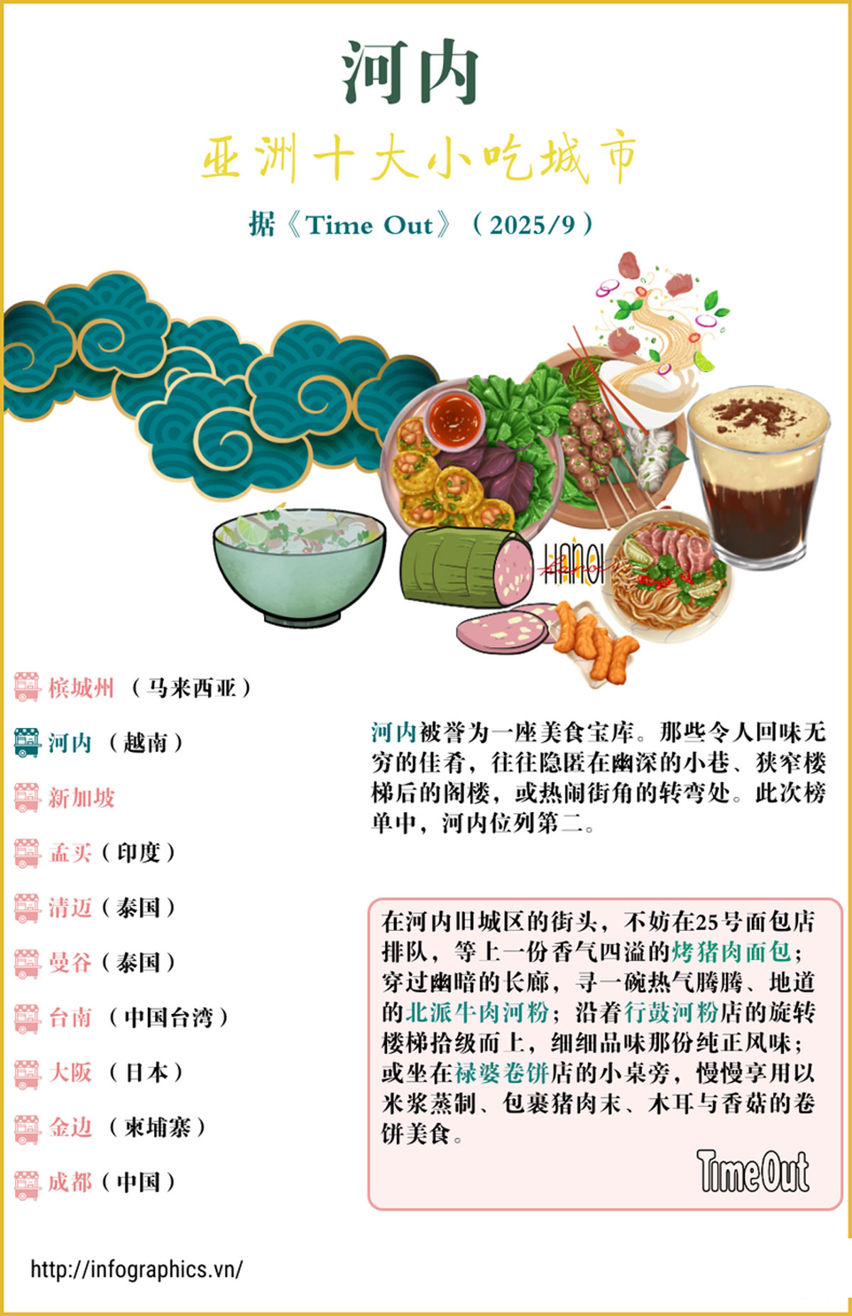 (北宁报网)河内入选《Time Out》杂志评选的“亚洲十大小吃城市”榜单。