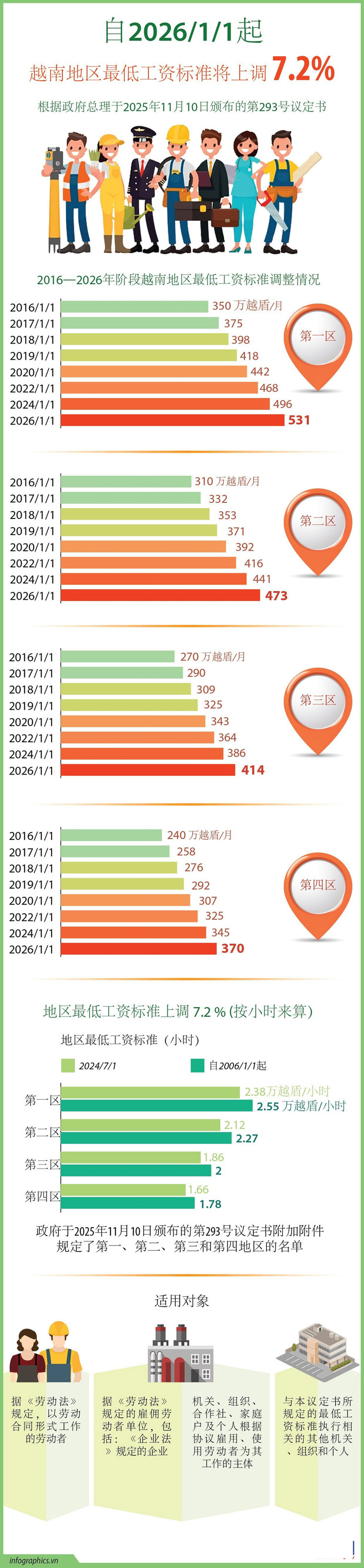 (北宁报网)越南地区最低工资标准将上调7.2%,2026年起生效。
