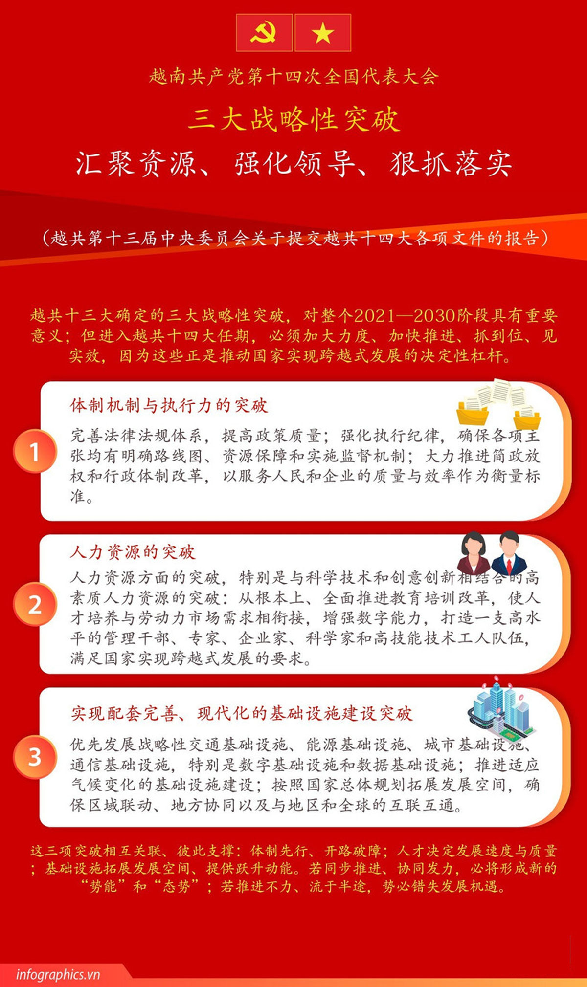 (北宁报网) 越共第十三届中央委员会关于提交越共第十四次全国代表大会各项文件的报告明确提出,三大战略性突破包括:集中资源、强化领导、狠抓落实。