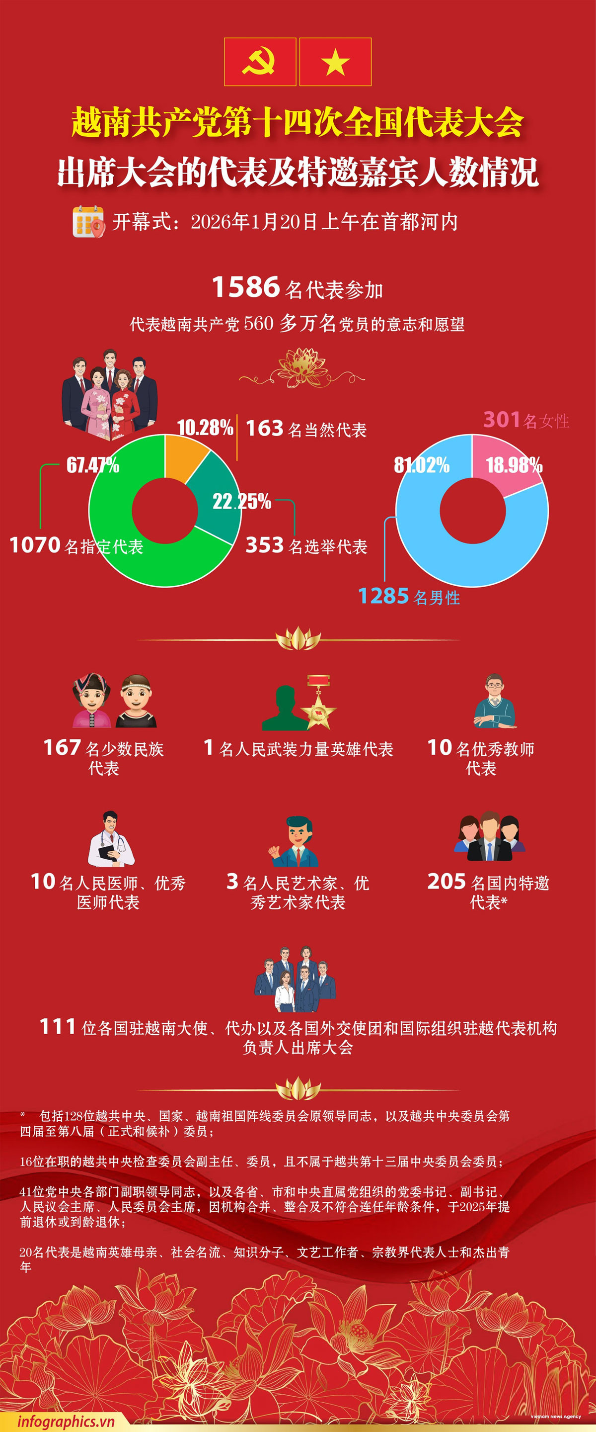 (北宁报网)出席越南共产党第十四次全国代表大会的共有1586名代表,代表着越南共产党560多万名党员。
