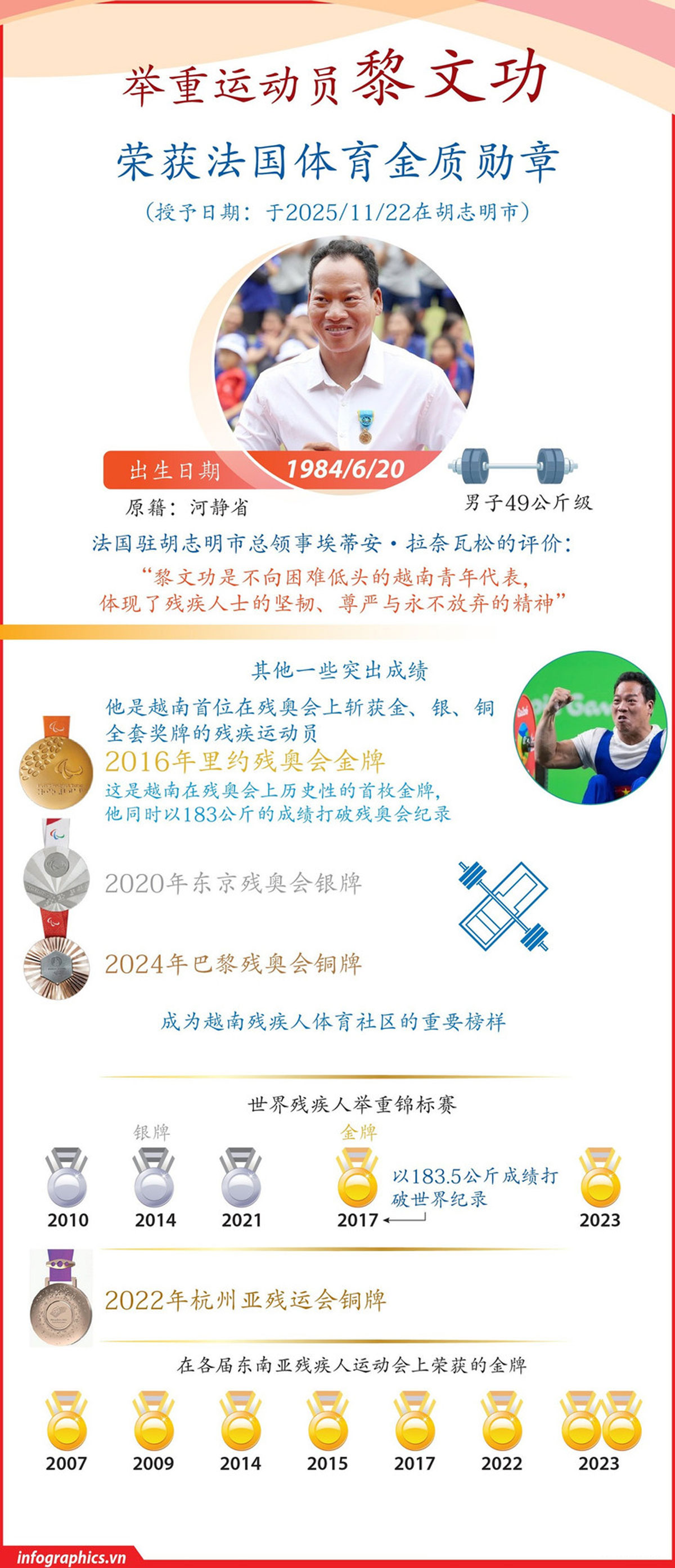 (北宁报网)越南残疾举重运动员黎文功(Lê Văn Công)近日获法国青年与体育部授予金质勋章,以表彰他近十年来在顶级赛场的杰出表现与卓越贡献。